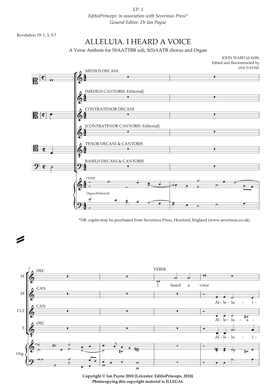 A large-scale verse anthem for SSAATTBB soli, SSAATB choir and organ, by the English madrigalist and consort-music composer John Ward (1590-1638), reconstructed by Ian Payne. It is musically related to the famous setting of the same Revelation text, by Thomas Weelkes. (Note that although the chorus is in five-parts (SAATB) throughout the body of the anthem, the final Amen has required the addition of a second Soprano strand to complete the harmony.)